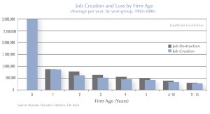 When analyzed by company age, the data are even more startling. Gross job creation at startups averaged more than 3 million jobs per year during 1992–2005, four times as high as any other yearly age group. Existing firms in all year groups have gross job losses that are larger than gross job gains.