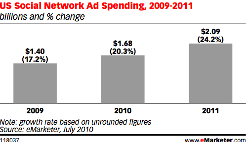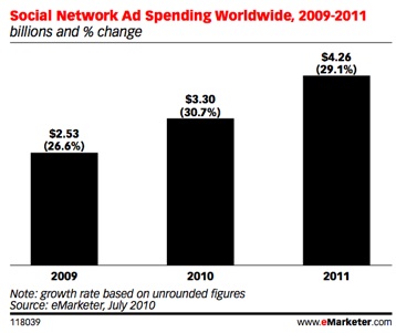 Social networks worldwide are estimated to bring in $3.3 billion in advertising dollars this year, according to updated estimates by eMarketer. That number represents a 31 percent increase from 2009’s $2.5 billion. A full 39 percent of that amount, or $1.3 billion, will go to Facebook.