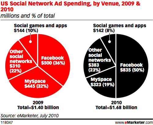 The big market share loser in social ads this year is MySpace, whose share is estimated to drop from 32 percent in 2009 ($445 million) to 19 percent in 2010 ($323 million). Social games and apps, interestingly, are also expected to pretty much stay flat in terms of ad revenues, with $142 million of the total this year. The social game segmentation really doesn’t make sense to me. It kind of makes me wonder whether the folks at eMarketer have ever heard of Zynga.