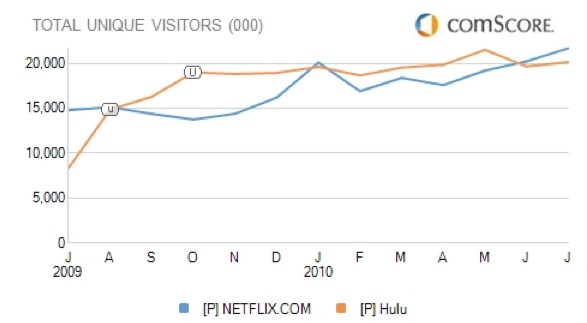 Meanwhile, Hulu’s biggest competitor in streaming video is perhaps Netflix, which is streaming more and more movies online, and TV shows as well. In June, more people went to Netflix.com than Hulu for the first time, and that trend continued in July. If you look beyond TV shows and include Netflix’s streaming movies, it’s catalog of streaming video is arguably better than Hulu’s. I could see some people subscribing to both—Netflix for movies, and Hulu for TV—and still saving a ton of money by getting rid of their cable plans or simply paring back to basic cable. But Hulu needs to fill in some major programming gaps before that starts to happen.
