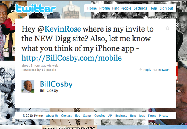 Lest you think some younger Diggnation-obsessed intern wrote the above missive, Cosby has the following disclaimer on his personal site, where you can connect with him on Facebook, Twitter, Myspace, Ustream, Cinch, Vimeo, 12Seconds, Blogtalkradio but NOT Digg,“Twust me, it’s really me Tweeting!”