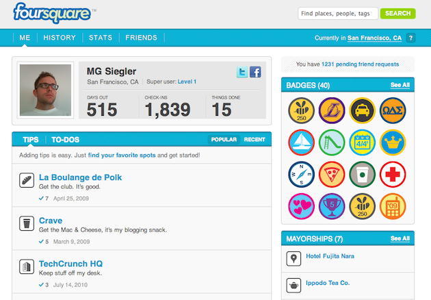 But for right now, that social layer is all that matters. They need to keep users engaged or they run the risk of becoming the Friendster of location. They’re coasting right now because most of the users are still new to the service and don’t have any fatigue just yet. But they’ll get there unless Foursquare keeps things interesting. Photos and comments in the stream couldn’t hurt (yes, like Gowalla). And neither could the ability to “like” check-ins. And a completely reworked point system would be good — maybe more closely tied to just your social graph. And one can never have too many badges.