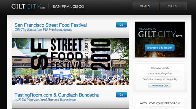 Gilt Groupe has offered online flash sales for years, selling products from luxury brands at steep discounts. That site is semi-exclusive as it requires an invite to join (though it isn’t tough to find one) — it looks like Gilt City doesn’t require an invite at all.