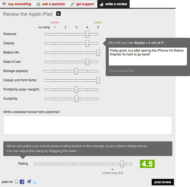 More importantly, this new system helps users review their gadgets. Now, when you click on the big red “write a review” button, you’ll see an area that simply asks you to move a slider from 1 to 5 (well, technically from “no rating” to 5) for the different criteria of a product. For example, for the iPhone 4, they ask you to rate things like “Reception & call quality,” “Display,” and “Battery life.” When you set the slider on one of these, a small text box appears that asks you to note why you gave the rating you did. This box limits you to stating your reason in 160 characters or less (and it’s optional).