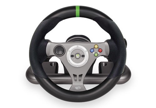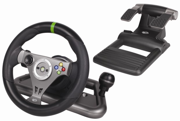 Mad Catz is dropping mad gearz all over Gamescom. Unfortunately, they haven’t sent us mad picz, so some details escape us. Basically, though, you’re looking at a nice racing wheel for the Xbox 360 with the usual fixins: battery power, pedals, buttons, the works. Update: got a better picture.