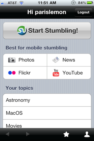 But there’s also a way to use the app that’s perfect for the small screens of the iPhone and Android phones. Right below the Start Stumbling button is a “Best for mobile stumbling” area. Here you’ll find links to “Photos,” “News,” “Flickr,” and “YouTube” that will show you only that type of content. Obviously, each of these is great for browsing quickly on a mobile device.