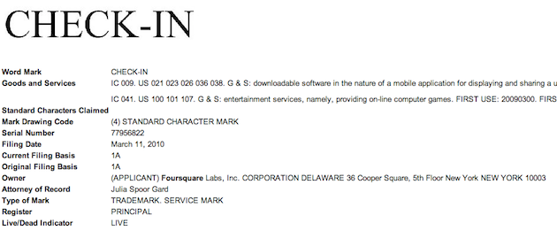 Foursquare’s filing for the check-in trademark identifies it as “downloadable software in the nature of a mobile application for displaying and sharing a user’s location and finding, locating, and interacting with other users and places.”