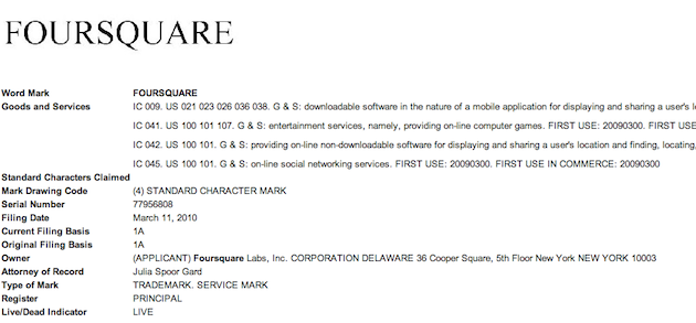 Interestingly enough, Foursquare is also having a difficult time trademarking their name. In June, the USPTO also turned down for a trademark on the name. But in that case it appears to be because Fourquare only sent a screenshot of their site and not the actual application for the USPTO to review. “The specimen is not acceptable as evidence of actual trademark use because it is an advertisement for the applicant’s website. Thus, it fails to show proper use on actual downloadable software,” they noted. Foursquare also has six months to respond to that.