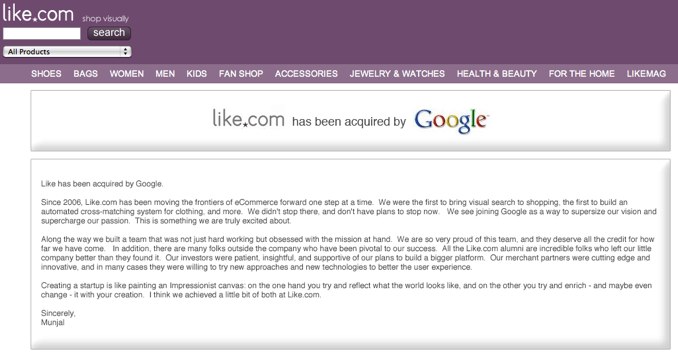 It’s official. Google has acquired Like.com. In a post on Like.com’s homepage, the company’s CEO and Founder Munjal Shah writes that the visual search engine has been bought by Google. We originally reported the acquisition last weekend. While terms of the deal were not disclosed, we’ve heard it’s valued at upwards of $100 million.
