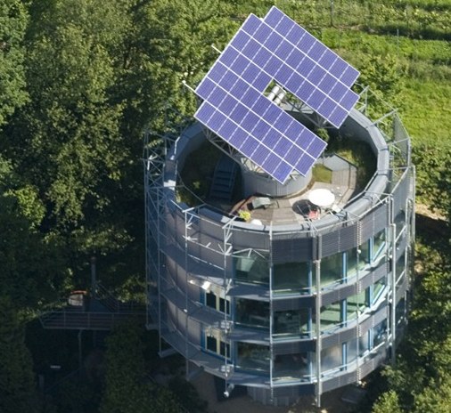 German architect Rolf Disch built the home, called Heliotrope, to follow the sun throughout the day. The structure features triple panes of thermally insulated glass to strike a balance between letting light in and keeping the house cooler inside.