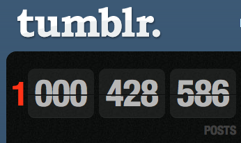 The blogging/microblogging/ social/whateveryouwanttocallit network has just crossed 1 billion total posts today. You can tell by looking at the number after the “/post/” area in each Tumblr blog URL. Sometime a couple hours ago, it passed 1 billion — and the broken counter on the Tumblr About page confirms this (it was only set to got up to 999,999,999).