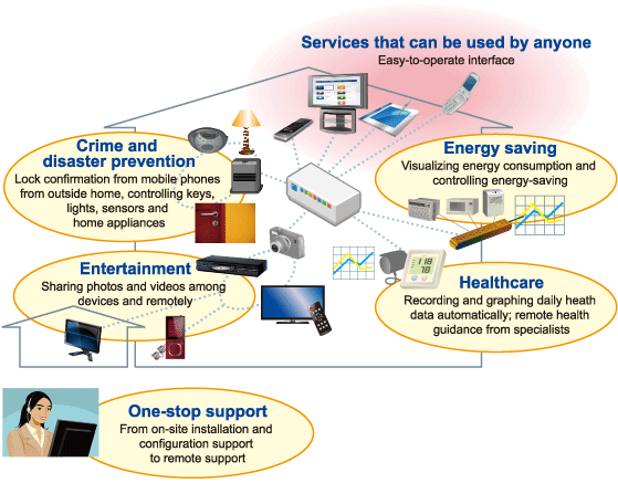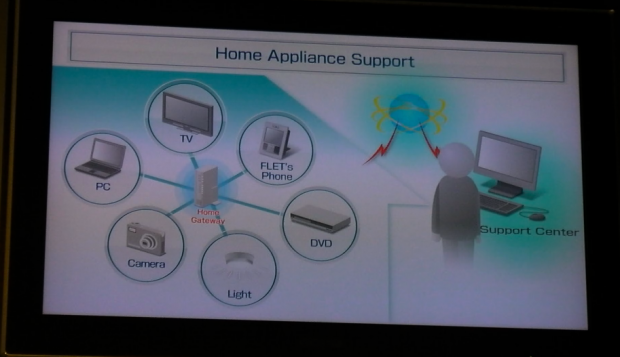 And thankfully, NTT let me capture some of the stuff they are working on in video form. One of the most impressive demos (more will be posted later) revolves around “Home ICT”. The idea here is to create a single, unified “Home Gateway”, which makes it possible to organize and control all devices and appliances people have in their houses through a cell phone, TV or other device (in a network).