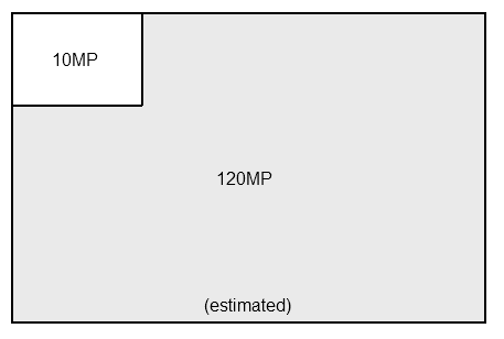 They say they can get 9.5 images per second off the sensor, which is impressive, but a 120-megapixel image would be… well, gigantic. That’s 13,280 x 9,184, and the resultant images would likely be several gigabytes. Systems that can write ten gigabytes per second are hard to come by, and certainly wouldn’t fit in a regular camera, so don’t get any ideas. We’re talking RAID arrays of RAID arrays here. I whipped up a quick diagram to show you what 120 megapixels would look like compared to 10.