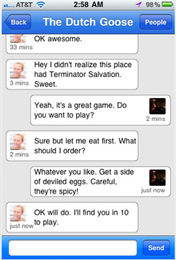 The app is very straightforward. Open it, and you’ll see a list of chat rooms that have been created within 1000 feet of you. Once you hop into a room, it’s a pretty standard chat channel. It’s safe to say that the application is still in a very early form — you can’t direct message users yet, and if your GPS signal goes out then you can’t chat, either. The company plans to add additional functionality, like ‘favorite’ chat rooms that you can access even if you leave the room’s proximity, in the next three weeks.