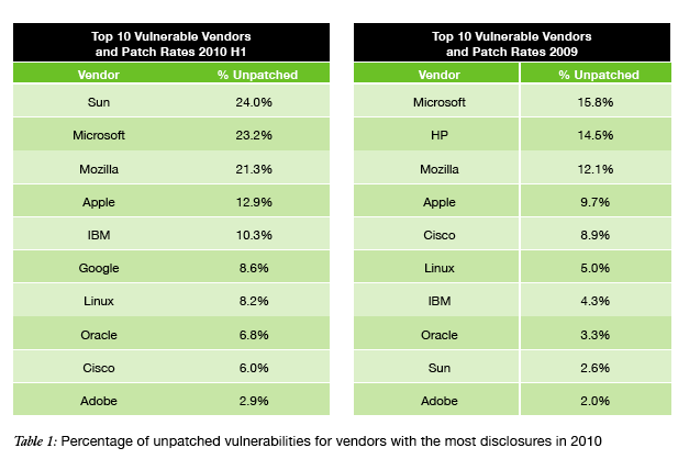 The report also ranks the vendors by percentage of unpatched vulnerabilities. Sun, which is now owned by Oracle, tops the list with 24 percent unpatched vulnerabilities, compared to 2.6 percent last year during the same period. Microsoft is second with 23 percent, Mozilla is third with 21 percent, Apple is fourth with 13 percent, and IBM is fifth with 10 percent.