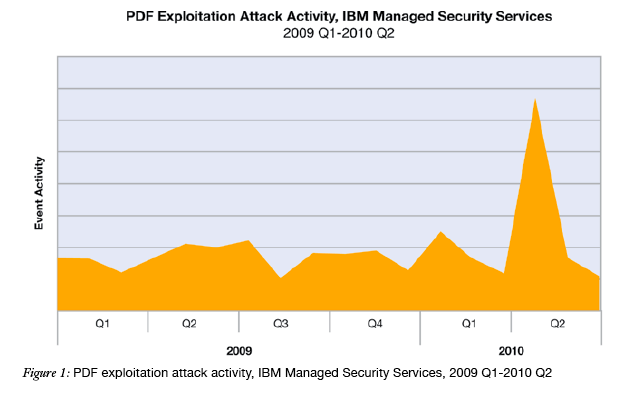 Another increasing source of attacks come from PDF exploits, which usually are downloaded unsuspectingly through links on Websites. Malicious PDFs spiked 37 percent, and those are just the ones that were detected. PDF exploits are being used to spread the Zeus and Pushdo botnets.