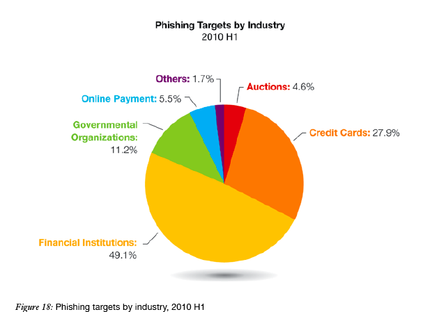 Interestingly, run-of-the-mill phishing scams seem to be down, with an 82 percent decline since their peak last year. But They are still the single biggest threat for financial institutions, which make up about half of all phishing targets, followed by credit cards, the government, online payments, and auctions.