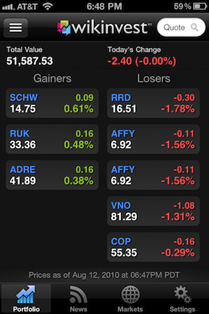 Wikinvest today launches its mobile initiative with its iPhone app, now live in the Apple store. As brokerages and the finance industry in general are usually late to the mobile and Internet game, the Wikinvest app is one of the first that allows iPhone users mobile access to their personal portfolios as well as the latest investment news.