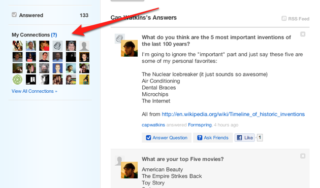 The system won’t use the traditional ‘follow’ model seen on services like Twitter. Instead, you’ll automatically establish a connection with a user whenever you answer one of their questions or they answer one of yours (there’s more to it then this, as the system will also use weighting to show your strongest connections). Of course, many of the site’s questions are asked anonymously, and no connection will be created if you ask or answer an anonymous question.