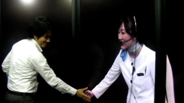 Here’s the fourth (and final) demo I witnessed at NTT‘s showroom “Note” [JP] in Tokyo: a futuristic apparatus for remote collaboration and education called “t-Room” [PDF]. While NTT’s Home ICT system, the telemedicine technology, and the digital signage system (now with one more video) were quite impressive, the t-Room certainly boasts the biggest wow factor.