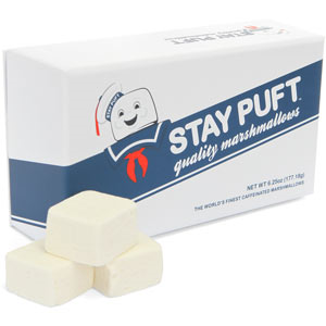 Two major things to note about these sugary mallows of awake-ti-tude: First, they are gourmet. Delicate and delicious. Second, they are licensed collectibles, which for a marshmallow is pretty awesome. Third, Stay Puft Caffeinated Gourmet Marshmallows come in a marshmallowy-feeling box – a nice reusable keepsake. And finally, fourth: Stay Puft Caffeinated Gourmet Marshmallows are CAFFEINATED! Big time. You feel it as soon as you suck one down. Take that giant marshmallow man; we’re eating your eggs one by one. So get some Stay Puft Caffeinated Gourmet Marshmallows now, relive the 80s, stay awake forever, and satiate the need for sugary revenge.