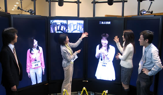 The so-called remote collaboration apparatus “t-Room” is probably the demo with the biggest wow-factor. The t-Room is essentially a room that consists of multiple video screens and that’s connected to other t-Rooms to share audio and video content remotely (again, over NTT’s next-generation network).