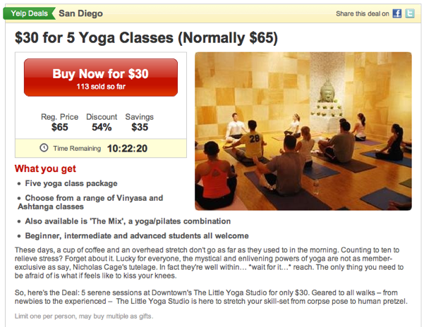 Last month we reported on a new experiment Yelp was running that put it in competition with the likes of Groupon and LivingSocial: time-sensitive daily deals, offering steep discounts at local businesses that users can pre-purchase. Reached for comment at the time, the company said that it was “always testing new things” and also pointed out some of the previous marketing programs it’s run over the years (it was essentially downplaying the experimental local deals).