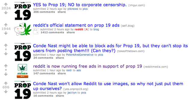The issue has come to a head over at Reddit, which reported to its users earlier today that its parent company Condé Nast would not allow it to accept paid ads in support of Prop. 19. Redditors predictably rebelled, voting up numerous stories in favor of the law (see screenshot below). And now, in a daring move, Reddit is fighting back too: it’s announced that it will begin running ads supporting Proposition 19, free of charge. Condé Nast was afraid of taking money in support of Prop. 19, so Reddit is making sure that doesn’t happen.