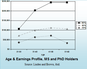 In their book Chips and Change, Professors Clair Brown and Greg Linden, of the University of California, Berkeley, analyzed Bureau of Labor Statistics and census data for the semiconductor industry and found that salaries increased dramatically for engineers during their 30s but that these increases slowed after the age of 40. At greater ages still, salaries started dropping, dependent on the level of education. After 50, the mean salary of engineers was lower—by 17% for those with bachelors degrees, and by 14% for those with masters degrees and PhDs—than the salary of those younger than 50. Curiously, Brown and Linden also found that salary increases for holders of postgraduate degrees were always lower than increases for those with bachelor’s degrees (in other words, even PhD degrees didn’t provide long-term job protection). It’s not much different in the software/internet industry. If anything, things in these fast-moving industries are much worse for older workers.