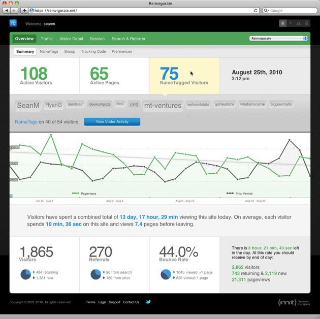 If you’re running a website — be it a world-famous news portal or a personal blog — there’s a good chance you spend a lot of time poring over your stats. There are of course plenty of services available to help with this, including the hugely popular Google Analytics. But the older systems tend to have lengthy lag times before they’ll generate a report, whereas services like Chartbeat show things as they happen. Given how quickly things spread across the web these days, the future is clearly real-time, and today sees the public launch of another powerful analytics service called Reinvigorate.net.