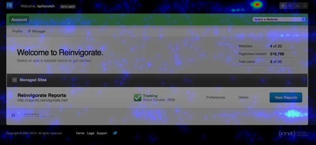 Reinvigorate.net also offers heat-maps, which allow you to see where users are clicking across each of your pages. These have been available through other services, like Crazy Egg, but the Reinvigorate team believes it’s the only service to offer both heat maps and live analytics in one package.