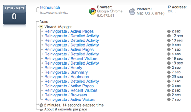 For example, to test out Reinvigorate.net I was given the test account ‘techcrunch’. You can see my browsing history as I bounced around the site in the screenshot below: