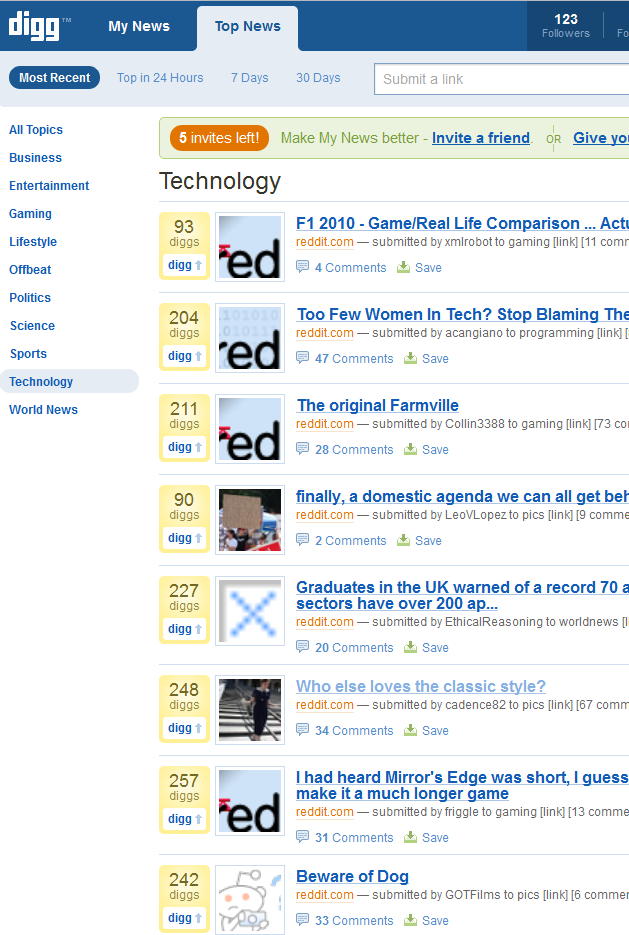 The news page on Digg, and particularly the Technology category, is currently plastered with links to discussions and images posted on rival Reddit instead. That’ll bring Reddit some traffic this morning, but more importantly it’s a bit of an embarrassing situation for Digg.