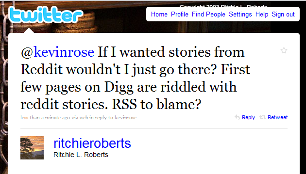 Update 2: as pointed out by many, the Reddit publisher account on Digg linked above auto-submits the RSS feed for Reddit content, so every dedicated discussion or image link URL automatically gets pushed onto the new Digg.