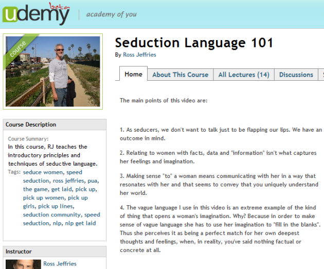 If you find something if interest, say Seduction Language 101, you can subscribe to the course and share it with your friends via the usual social networks.