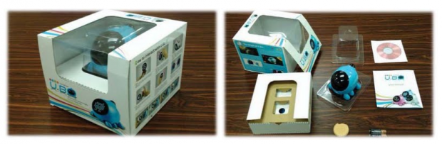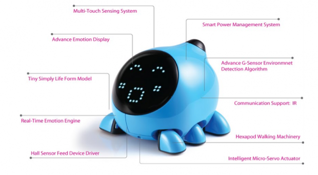 The robot, which is sized at 100x85x76mm (weight: 210g) can be remote-controlled and features Bluetooth, an accelerometer, two DC motors, and a 0.5W speaker.