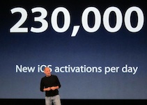 Apple is activating 230,000 iOS devices a day, Jobs says. He made a thinly veiled reference to the Android numbers, and said “we think some of our friends are counting upgrades in their numbers.” Jobs said Apple is not doing that — if they were, the numbers would be much higher.