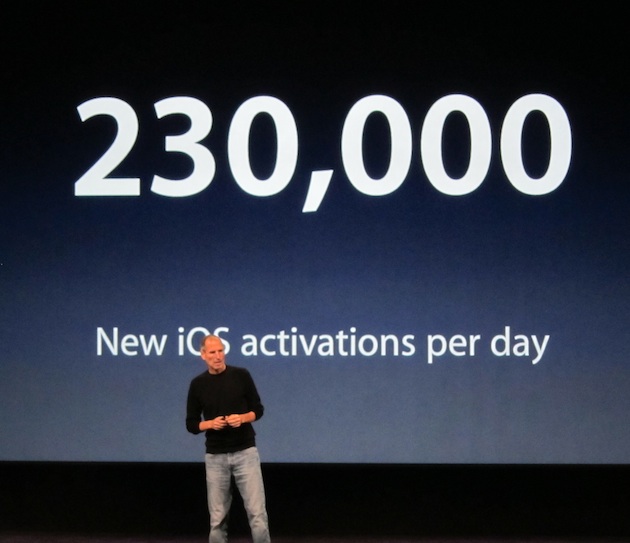 Last month, Google CEO Eric Schmidt noted that Google was activating 200,000 Android devices a day. Obviously, that’s a massive number. Today during the Apple event in San Francisco, Steve Jobs took the chance to one up him — then take a shot at Google.