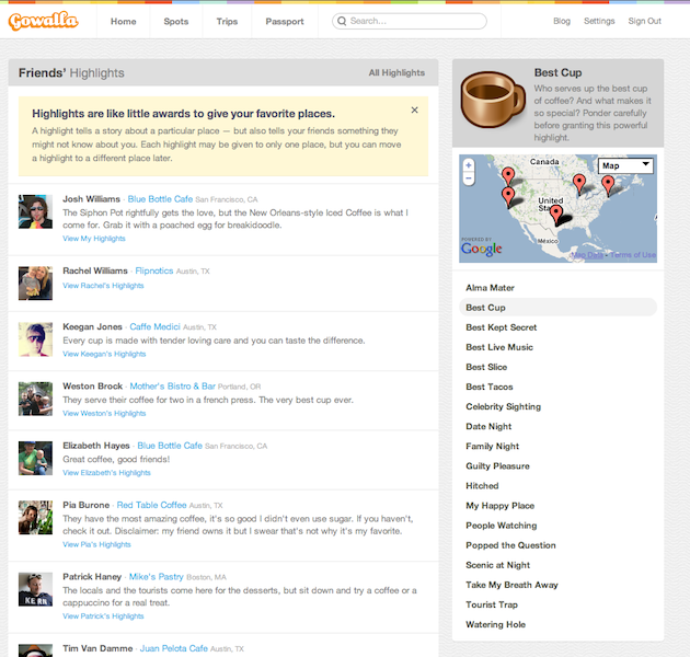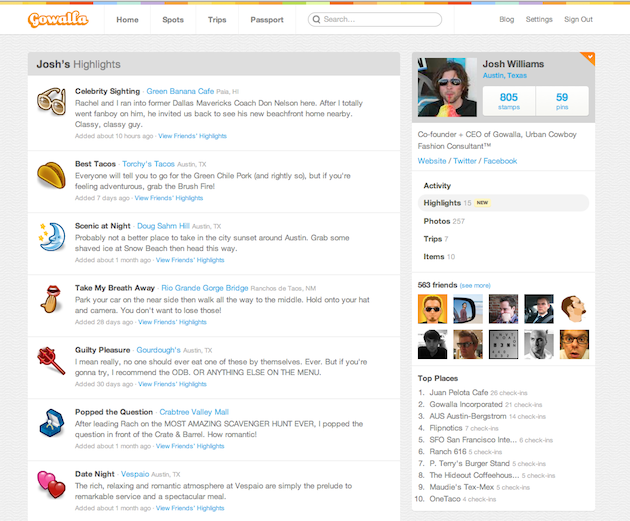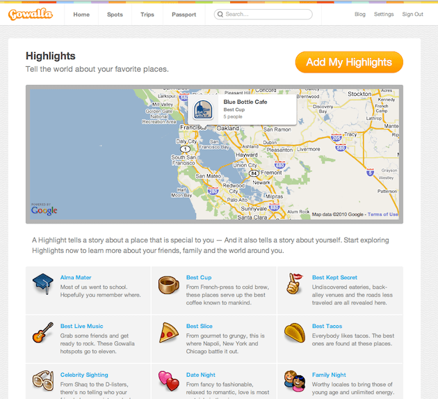 And co-founder Josh Williams knows that. He thinks of Highlights as sort of a replacement for the atlas. “In 2010, what was the best scenic view point in Seattle?,” Williams wonders. With Gowalla Highlights, he’d be able to tell that.