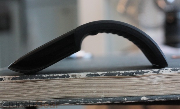 The most salient feature is, of course, the bending. When it’s flat, the mouse is off; curl its tail, though, and it springs to life. Well, its optical sensor comes on, anyway. There is only one way to bend the mouse — no custom shapes for you. Upside-down, it looks like a grub.