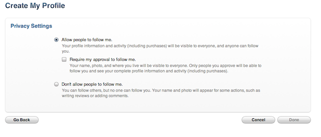 To be more clear, Apple asks you to decide between two things: do you want to allow people to follow you, or do you want no one to be able to follow you? The latter is a nice option because you can still use Ping, you simply use it as a lurker. You can see what other people with public profiles are doing, but they can’t see what you are doing. The other option is to let people follow you — but there’s a sub option to this. You can either let anyone follow you (think: Twitter) or you can get notifications to approve everyone who wants to follow you (think: Facebook).