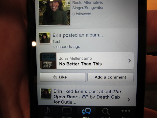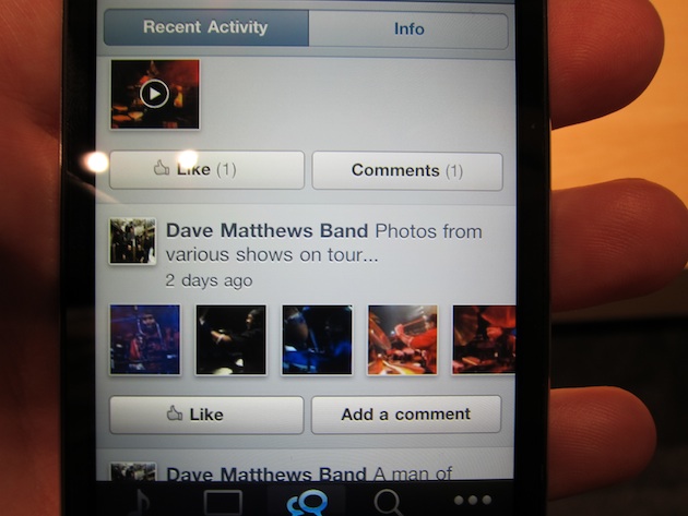 Here’s a page for an artist showing their most recent activity on Ping. Arists can upload pictures (such as from tours) and videos to this feed. Obviously, there is the nice one-click purchase of music.