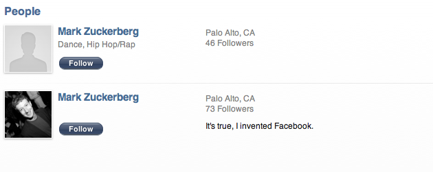 While Facebook Connect will no longer help you find Zuckerberg there, if you do a simple name search, there he is. Well actually, there he is twice. Hmm. Which one to choose?
