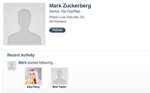 Nope. As tempting as it is to think that Zuckerberg actually filled in his profile to say “It’s true, I invented Facebook,” this is a fake account. The one with no picture and less followers? That’s the real Zuck. He follows two people, Katy Perry and Bret Taylor. One of those is a famous pop singer, the other is Facebook’s CTO. I’ll let you sort that out.