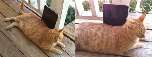 Reader Gary sent us pictures of his cat blocking his iPad, reminding us all that beasts like this cat know that we are throwing our lives away on technology and our inexorable march to a life chained to machines will cause us more suffering than we know.