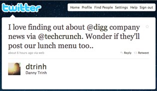 Digg Designer Danny Trinh Twitters “I love finding out about @digg company news via @techcrunch. Wonder if they’ll post our lunch menu too..”