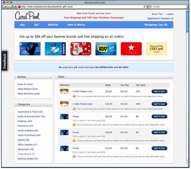 Cardpool, a Y-Combinator startup founded by Anson Tsai (formerly of Anywhere.FM) and Timothy Wong, is trying to change that. Starting this morning, Cardpool will give current members the option to purchase instant redemption gift cards. While the site will still send the physical card via snail mail, a user gets immediate access to the card’s codes for online use.