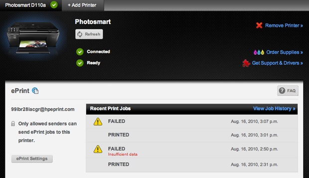 But the real feature of the D110a is that it comes with an email address. This means you no longer need to install any software on your computer to print: you simply email documents to your printer’s email address. The whole thing revolves around the new HP ePrint service. You can add multiple ePrint-enabled printers to your account there, review each printer’s print queue, and more.