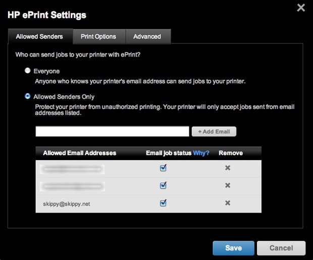 Your printer is further protected by a whitelist of permitted senders. It’s trivially easy to add new addresses, and once added they can immediately begin sending stuff to your printer. I tried setting up a single-user group on my Google Apps for Domains account, so that I could have printer@skippy.net print to the D110a, but the way Google Apps handles those groups does not work with the ePrint service: all jobs sent to printer@skippy.net failed to print because it looked like more than one recipient was included on the message.