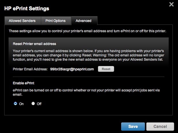 The printer I’ve been using has the email address 99ibr28iacgr@hpeprint.com, which isn’t exactly memorable, but once you add it to your address book you won’t need to remember it too often (and you can always retrieve it from ePrint site). Each ePrint-enabled printer is assigned a goofy 12-character address primarily to make it somewhat more time-consuming to would-be miscreants to try to stuff unwanted print jobs down your printer.